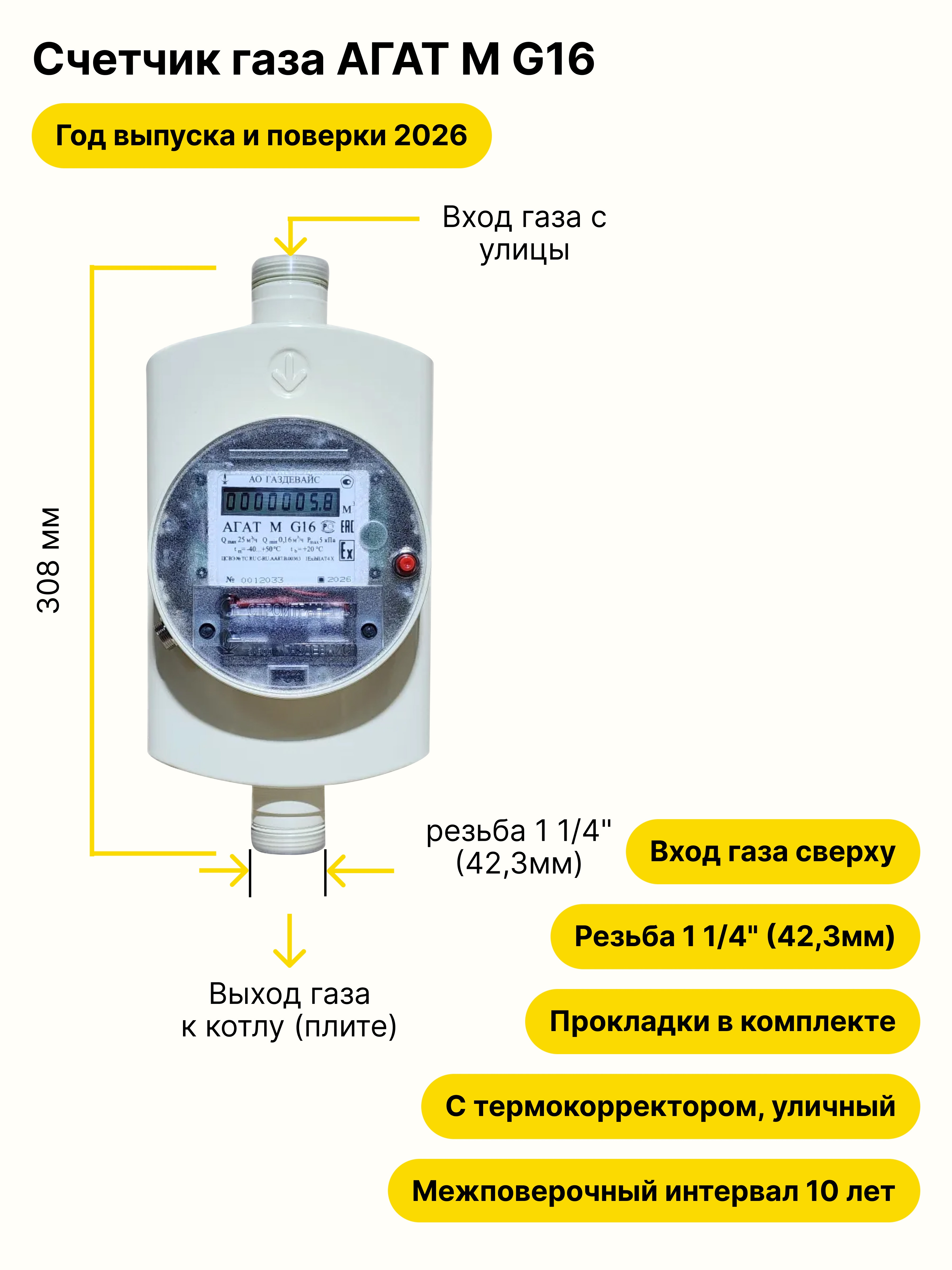 1. Счетчики газа ультразвуковые с автоматической температурной компенсацией АГАТ (G16; G25) предназначены для измерений прошедшего через них объема газа (природного газа по ГОСТ 5542, сжиженного газа по ГОСТ 20448 и других не агрессивных газов) в газовпроводе низкого давления, с приведением измеряемого объема газа к нормальным условиям по температуре (+20°С), по ГОСТ 2939.