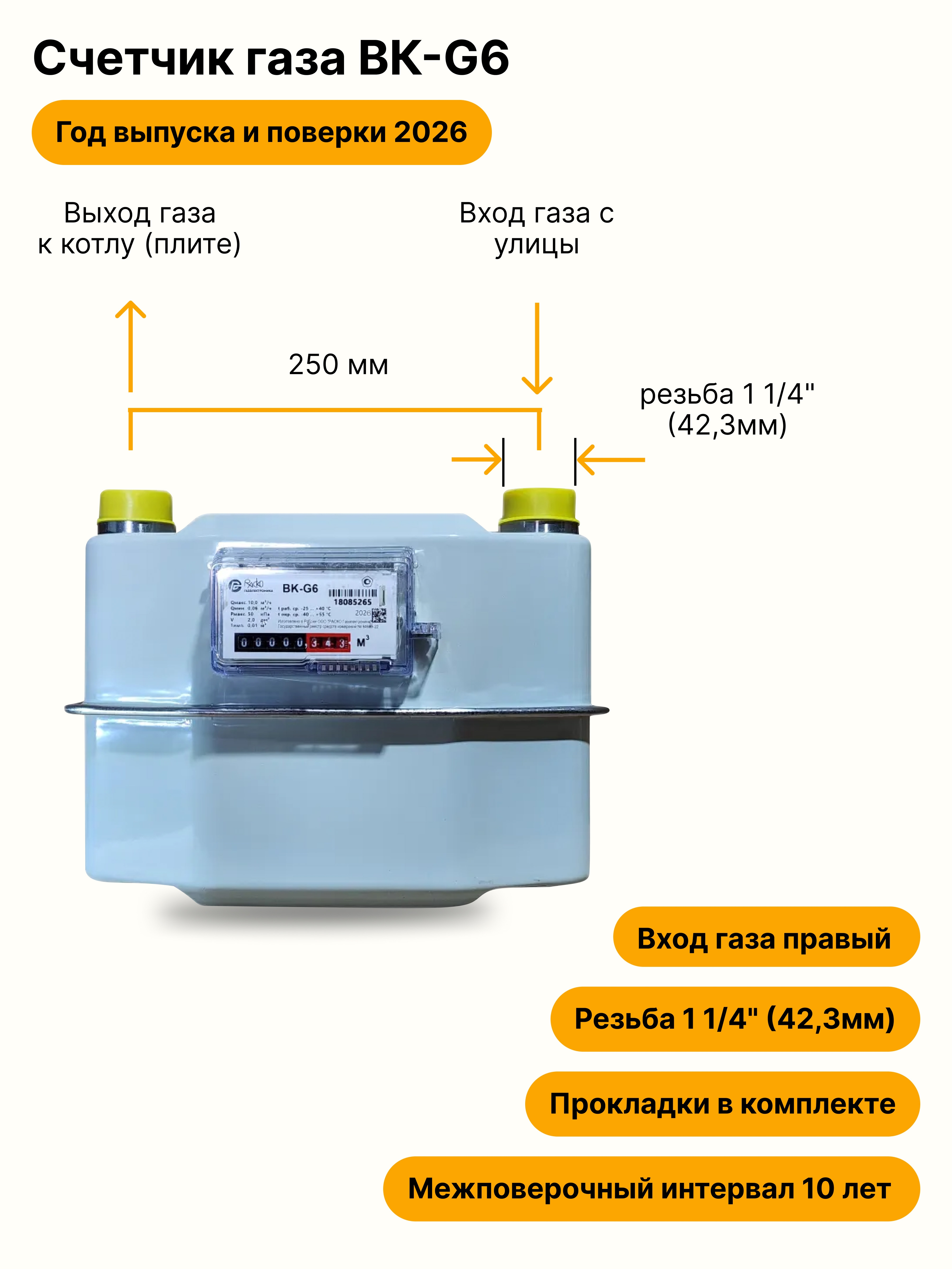 Счетчик газа BK-G6 250мм (правый) (V2 двухкамерный) мембранный бытовой 2026г
