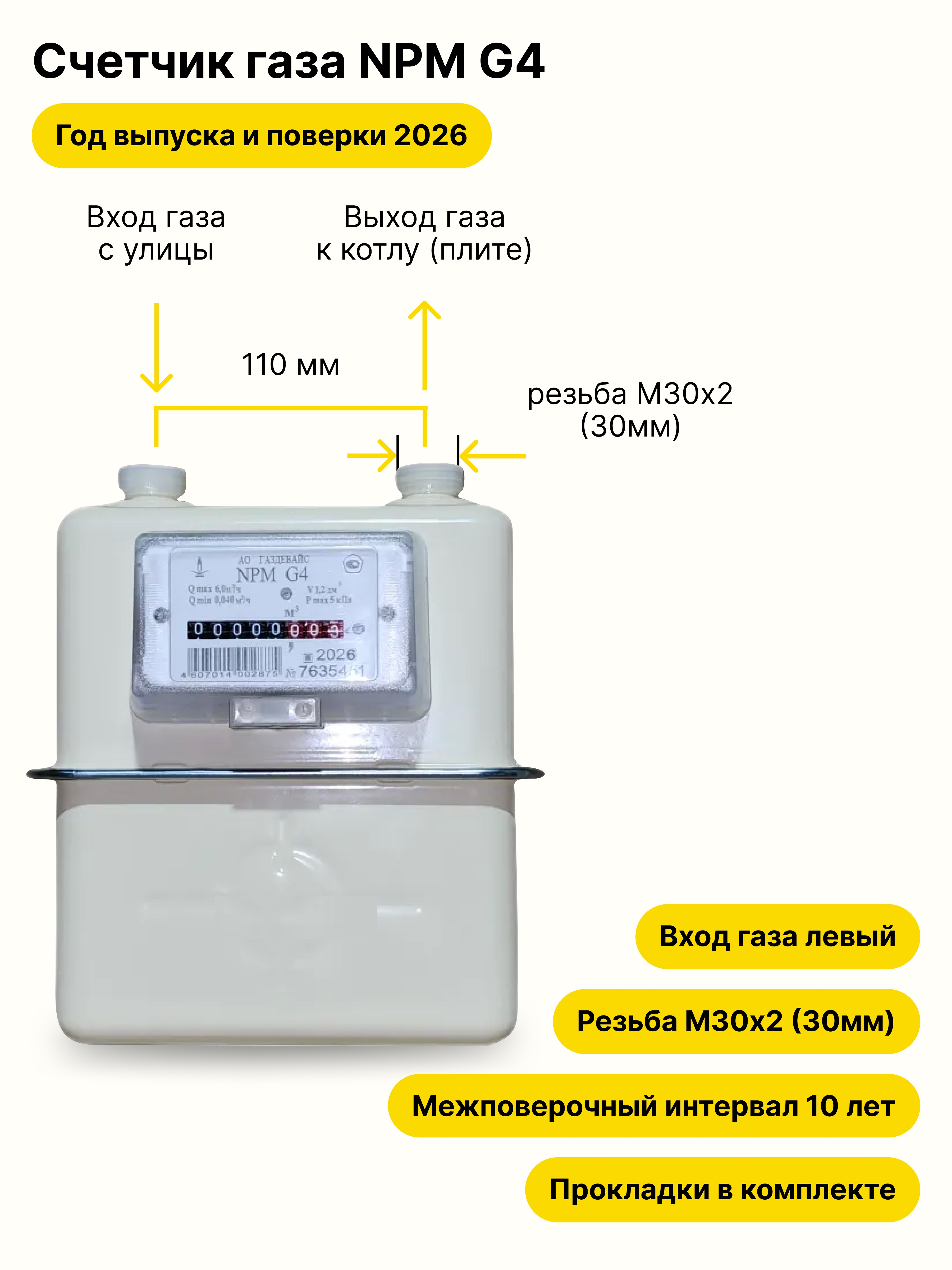 Ключевые особенности счетчика газа NPM-G4 левый, вход М30 х 2, 2026 года выпуска.